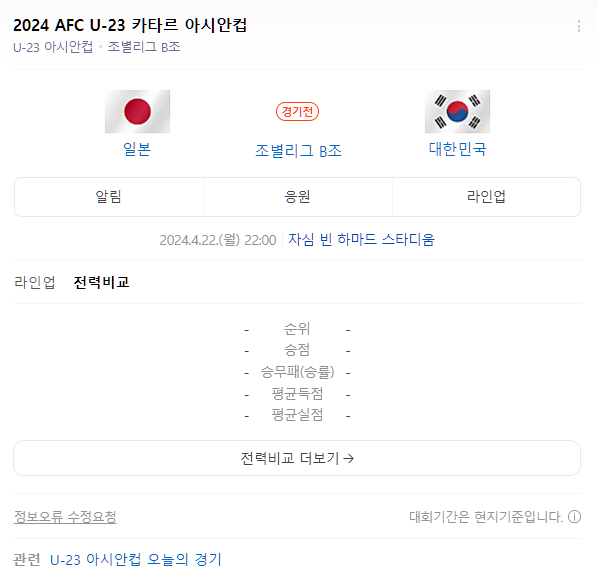 U-23 아시안 컵 대한민국 B조 경기일정(20240422 기준)